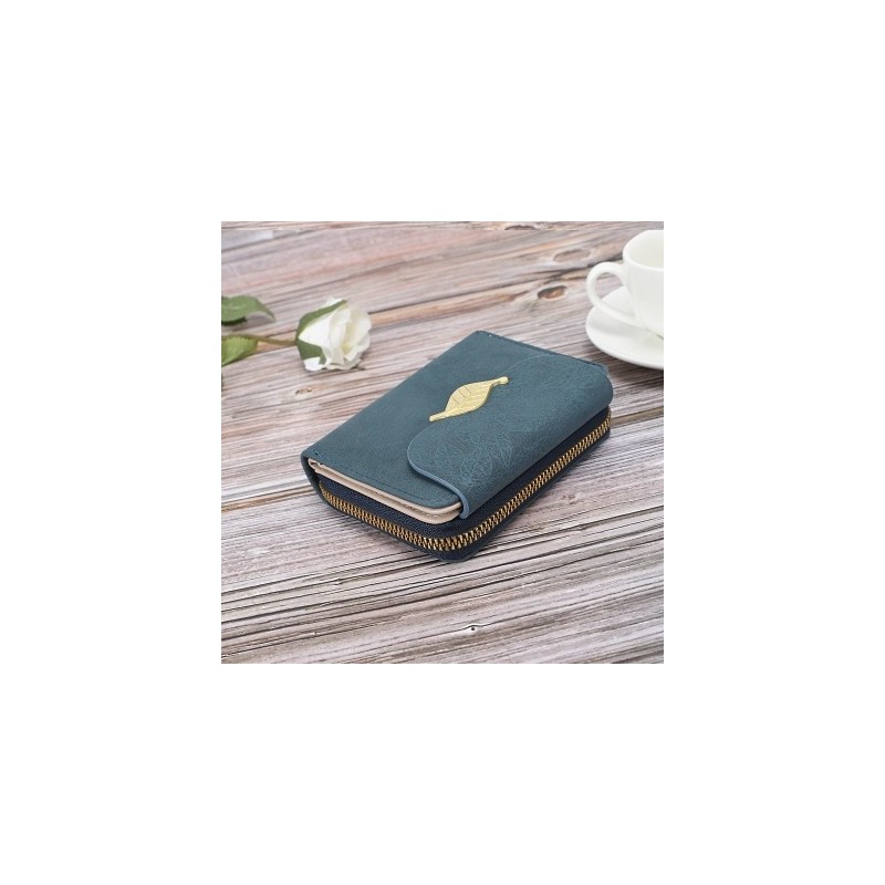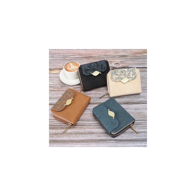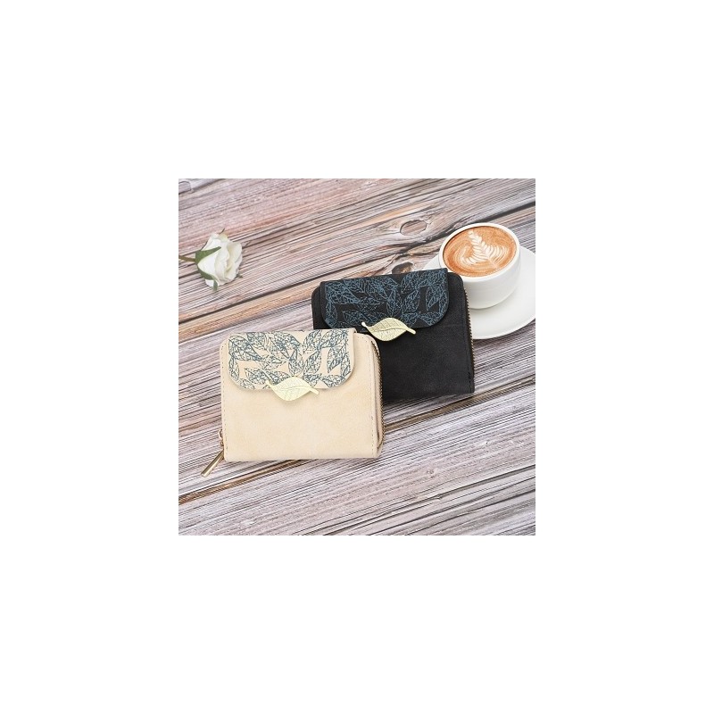 Women Short Purse Leaf Design Zipper Female Card Holder Coin Bag Printed Color Clamshell PU Wallet Ladies Students Mini Clutch