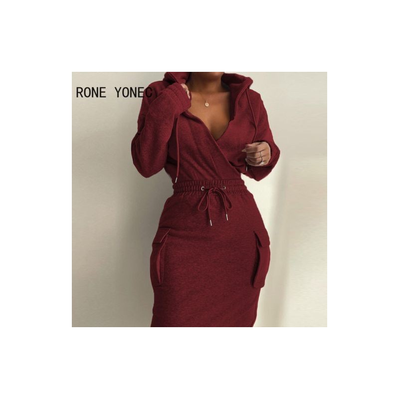 Women Solid Hooded Tape Casual Wrap Dress Long Sleeves Pocket Elastic Waist Sweatshirt Dress