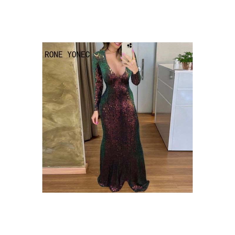 Elegáns női elegáns, mély V nyakú színátmenetes Maxi Bodycon szexi hivatalos party ruha