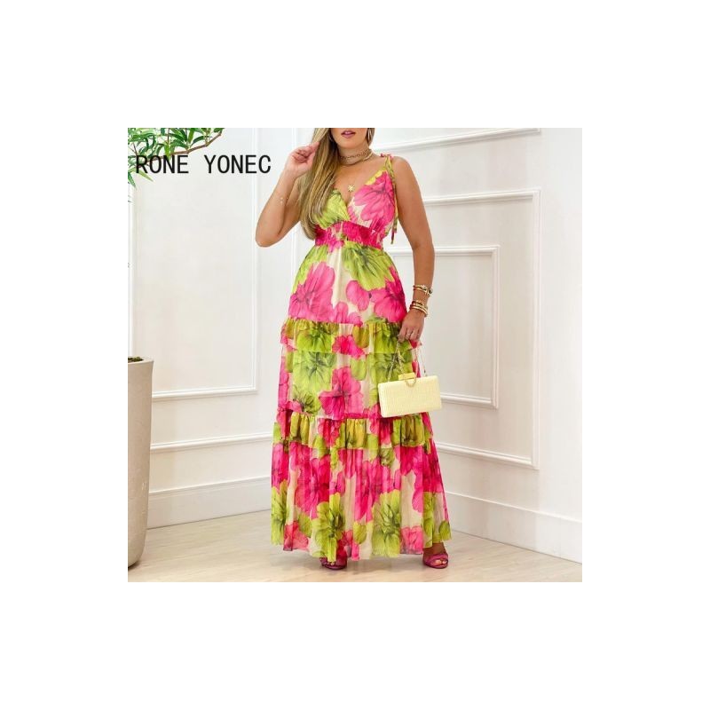 Elegáns női spagettipántos fűzős nyomat virágos Maxi nyári tengerparti nyaralóruhákkal