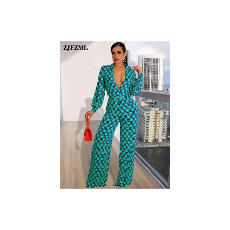 Lenyűgöző nyomtatású Bodycon széles lábú jumpsuit lányoknak póló nyakú teljes ujjú egyrészes overall Vintage magas derekú formális nadrág